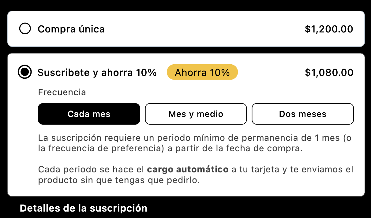 Para que se active una suscripción al momento de comprar haces clic en "Suscríbete y ahorra", elegiste la frecuencia con la que quieres recibir los siguientes pedidos y también se incluye un aviso en el check out antes de que haces el pago. Es la única forma en la que se activa una suscripción.